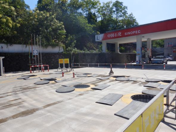 加油站設置汽油卸油和加油油氣回收系統。加油區設置加油罩棚,罩棚為混凝土框架結構罩棚。罩棚下設置4臺雙油品雙槍自吸式加油機(汽油加油槍帶油氣回收);埋地油罐區設有4只30m³埋地臥式單層鋼制油罐(油罐均為車道罐,設置在承重防滲罐池內),其中2只30m³汽油罐(分別儲存92#汽油和95#汽油),2只30m³柴油罐(儲存0#柴油),折合油罐總容積為90m³(柴油罐容積折半計入),根據《汽車加油加氣加氫站技術標準》GB50156-2021的相關規定,該加油站為三級加油站。